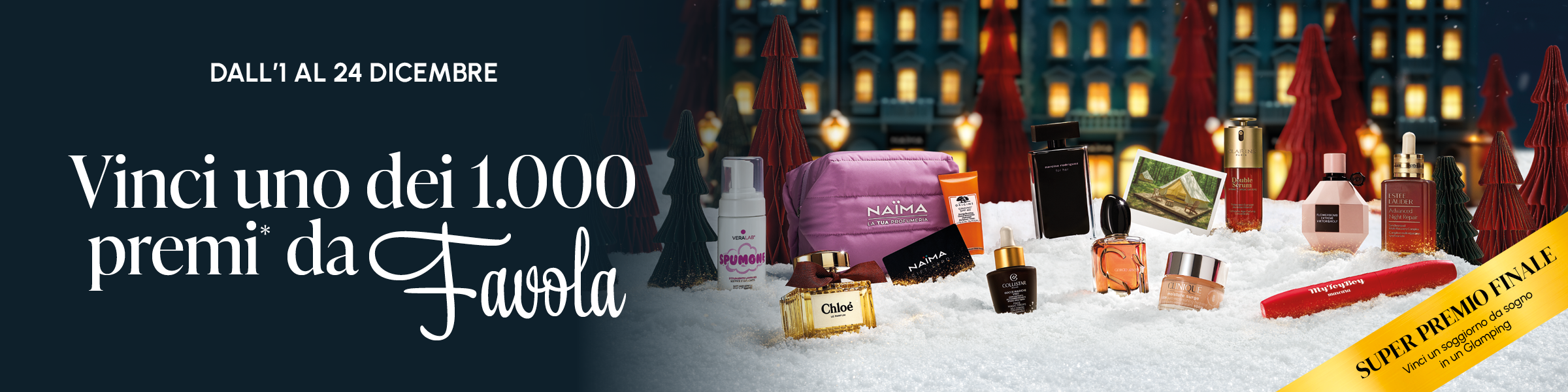 🎁 Dall’1 al 24 dicembre partecipa al Concorso di Natale Naïma: puoi vincere uno dei 1.000 premi da favola e accedere all’estrazione del super premio finale, un soggiorno da sogno in glamping.