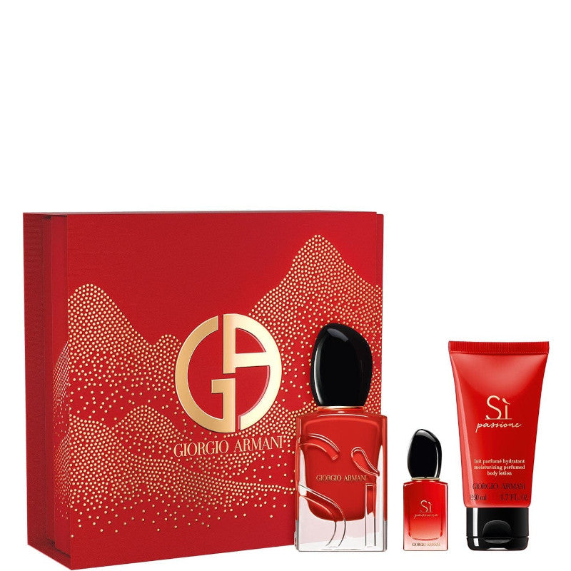 Questo set regalo da donna Sì Passione Eau de Parfum è composto da una fragranza da 50 ml, un profumo minitaglia da 7 ml e una lozione per il corpo da 50 ml.
