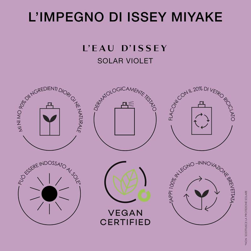 Ispirata ai petali della violetta, una delicata nuance di viola avvolge il flacone e Il pack esterno di L’Eau d’Issey Solar Violet. La forma iconica del flacone, realizzato in vetro trasparente, richiama la purezza dell’acqua, mentre il tappo in legno simboleggia la densità della materia.