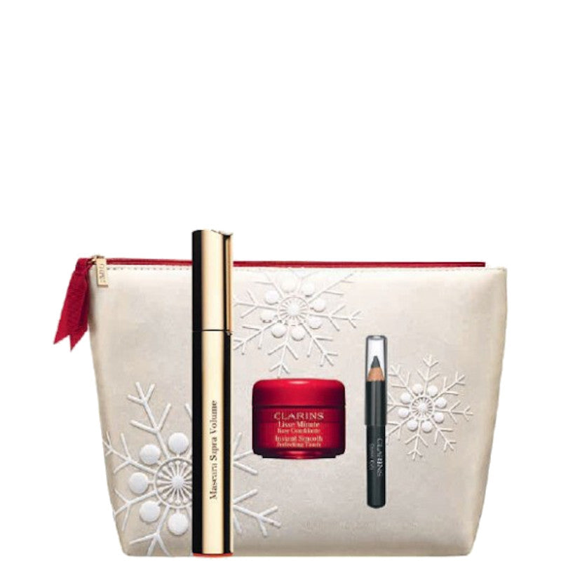 La confezione comprende il mascara Supra Volume Nero, una mini Matita Occhi Crayon e il 4 ml Lisse Minute (base correttiva rughe effetto matt).